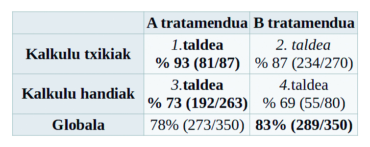 Adibide hau benetako azterketa mediko batetik hartua da, giltzurruneko kalkuluetarako bi tratamenduren arrakasta-tasak alderatzen ditu. Taulak tratamendu horien arrakasta-tasak erakusten ditu: ehunekoak eta kopuru zehatzak ematen ditu, eta kalkulu txikien tratamenduak eta kalkulu handienak bereizten. A tratamenduak prozedura kirurgiko irekiak eta B tratamenduak prozedura kirurgiko itxiak hartzen ditu barne. Parentesi arteko zenbakiek taldearen guztizko tamainarekiko arrakasta-kasuen kopurua adierazten dute.